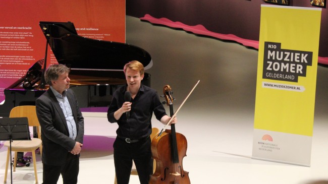 Douwe vertelt het publiek over zijn plannen: 12 cellisten op een podium deze zomer? Of een ontmoeting met een wetenschapper? We zijn benieuwd!